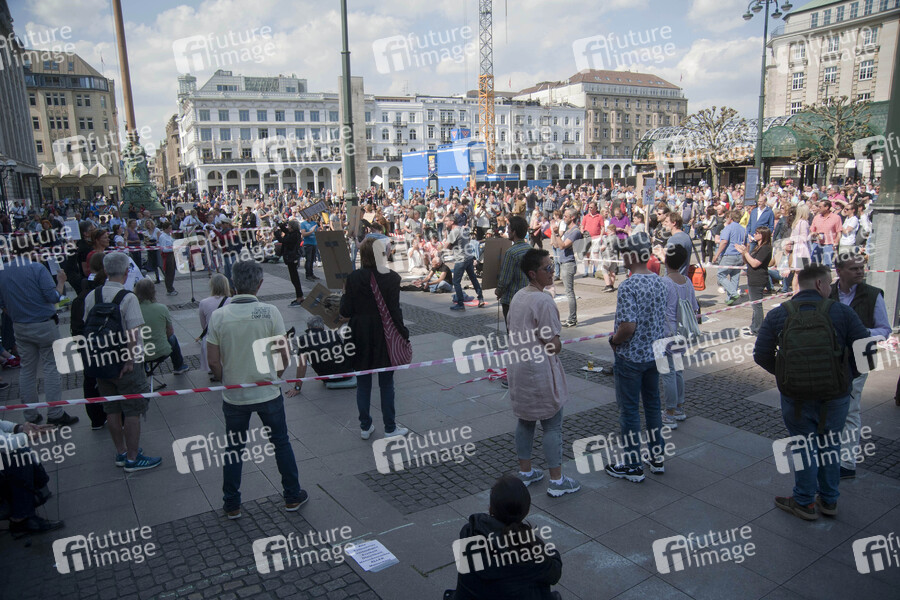 Demonstranten auf der Demo gegen die Einschränkung der Grundrechte wegen der Covid-19 Pandemie vor dem Hamburger Rathaus. Hamburg, 09.05.2020