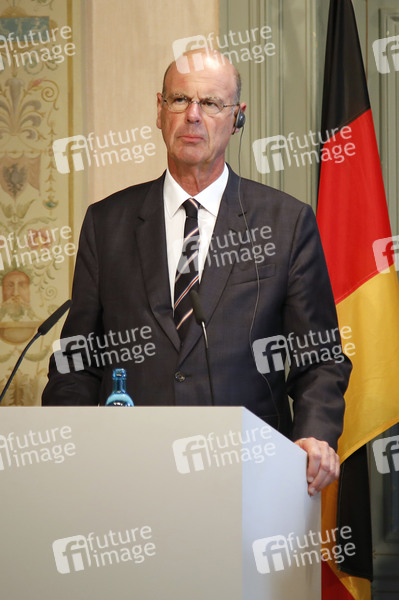 Eric Lombard bei der Begrüßung und darauf folgender Pressekonferenz bei der deutsch-französischen Klausur der Finanzminister im Schloss Genshagen. Ludwigsfelde, 16.07.2025