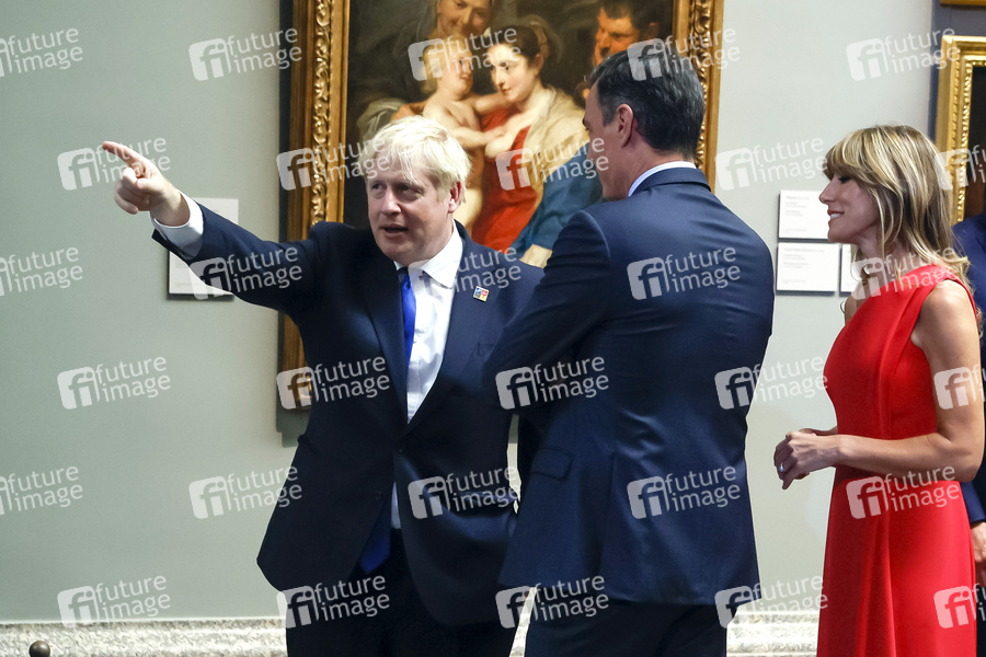 Boris Johnson und Pedro Sanchez mit Ehefrau María Begona Gomez Fernández bei der Ankunft zu einem informellen transatlantischen Abendessen der NATO Staats- und Regierungschefs im Prado-Museum. Madrid, 29.06.2022
