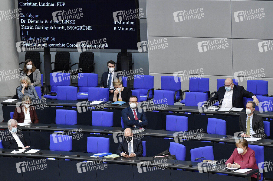 Horst Seehofer, Anja Karliczek, Christine Lambrecht, Franziska Giffey, Olaf Scholz, Jens Spahn, Peter Altmaier, Hendrik Hoppenstedt und Angela Merkel in der 222. Sitzung des Deutschen Bundestages im Reichstagsgebäude. Berlin, 16.04.2021