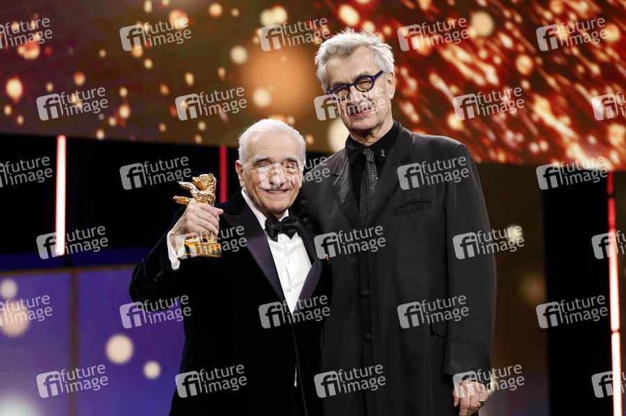 Martin Scorsese und Wim Wenders bei der Verleihung des Goldenen Ehrenbären an Martin Scorsese auf der Berlinale 2024 / 74. Internationale Filmfestspiele Berlin im Berlinale Palast. Berlin, 20.02.2024