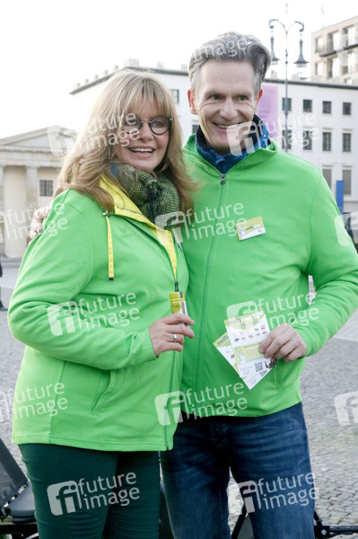 Maren Gilzer mit Ehemann Harry Kuhlmann bei der Präsentation ihres gesundheitsfördernden Superfoodsaftes von multishot am Brandenburger Tor. Berlin, 20.11.2020