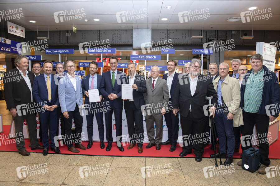 Hendrik Wüst mit Vertragspartnern und Mitwirkenden bei der Unterzeichnung der MOF 3-Vereinbarung im Kölner Hauptbahnhof. Köln, 06.06.2019
