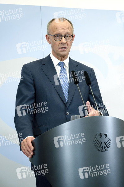 Friedrich Merz beim Pressestatement zu Kabinettsthemen nach der 14. Sitzung des Bundeskabinetts im Bundesministerium der Verteidigung. Berlin, 27.08.2025