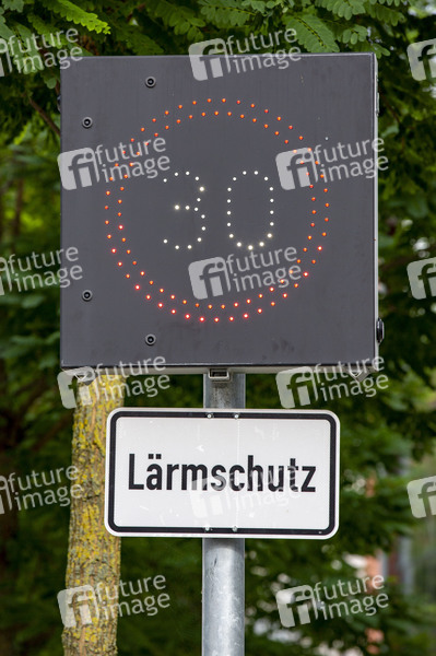 LED-Tempo 30-Schild und Hinweisschild 'Lärmschutz'. Friedrichshafen, 18.08.2020.