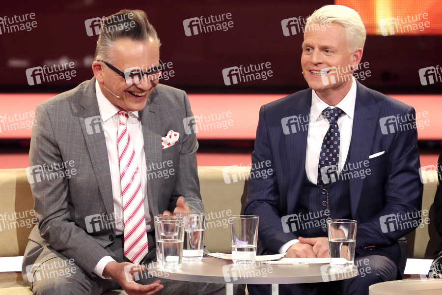 Götz Alsmann und Guido Cantz bei der Aufzeichnung der ARD-Unterhaltungsshow 'Verstehen Sie Spass?' in den Bavaria Studios. Geiselgasteig bei München, 03.04.2019