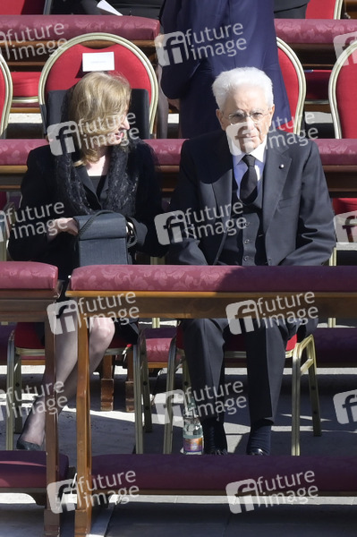 Sergio Mattarella mit Tochter Laura Mattarella bei der Trauermesse für den verstorbenen Papst Franziskus auf dem Petersplatz. Vatikanstadt, 26.04.2025