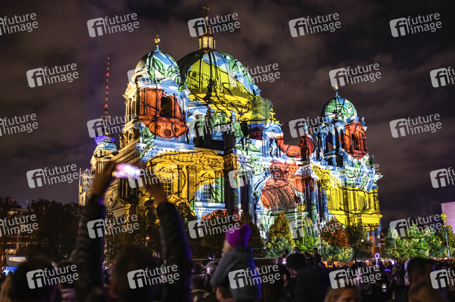 Der Berliner Dom am Lustgarten auf der Museumsinsel. Das Festival of Lights Berlin gehört zu den bekanntesten Lichtfestivals weltweit. Es ist ein kostenloser Event in Berlin, der jährlich im Herbst stattfindet und 10 Tage lang bekannte Berliner Sehenswürdigkeiten durch Illuminationen, lichtkünstlerische Projektionen und 3D-Mappings aufwändig in Szene setzt. Berlin, 06.10.2024