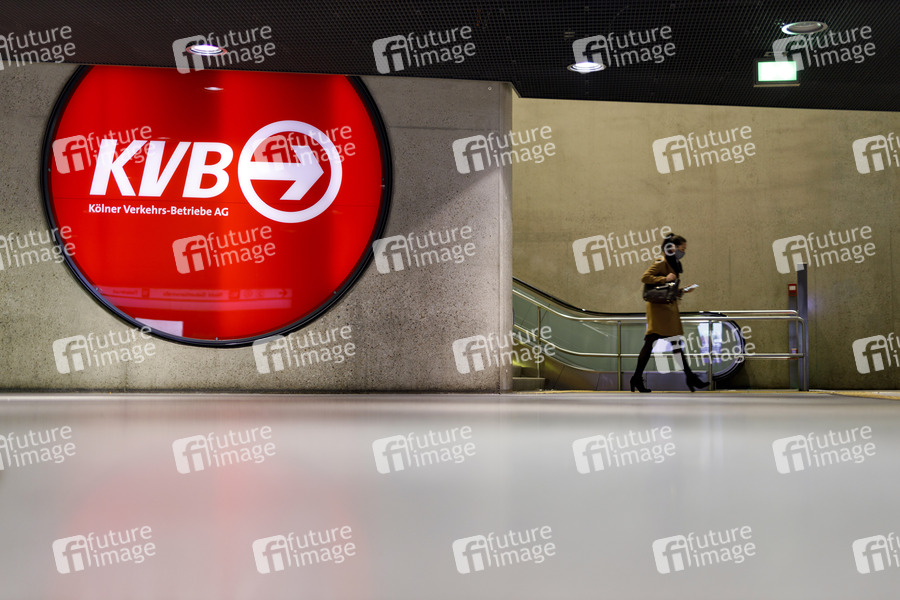Ein Logo der Kölner Verkehrsbetriebe (KVB) an der U-Bahn-Haltestelle Breslauer Platz. Wegen eines flächendeckenden Warnstreiks im öffentlichen Nahverkehr standen am 8. Oktober viele Busse und Bahnen in NRW still. (Themenbild, Symbolbild) Köln, 13.10.2020