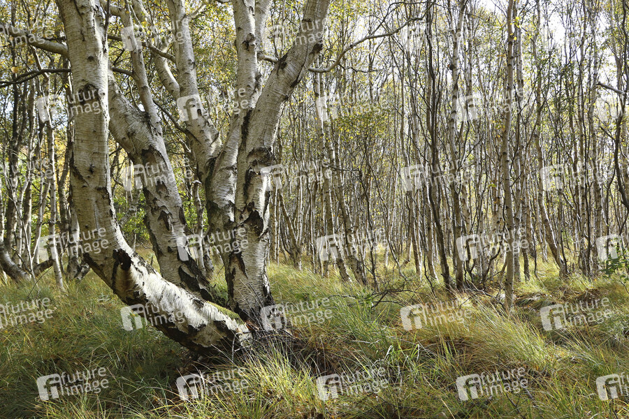 Birken im Gegenlicht im Wald bei der Vogelkoje auf der Insel Amrum. 22.10.2020