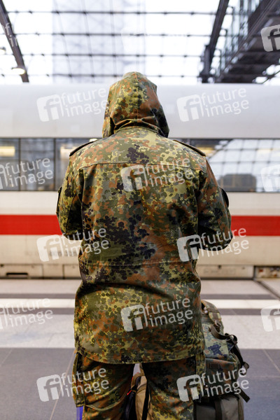 Ein Bundeswehrsoldat reist mit der Bahn. Alle in einem aktiven Dienstverhältnis stehenden Soldatinnen und Soldaten der Bundeswehr reisen in Uniform, mit Truppenausweis und Bundeswehr-Ticket bei der Deutschen Bahn kostenfrei. (Themenbild, Symbolbild) Berlin, 21.01.2021