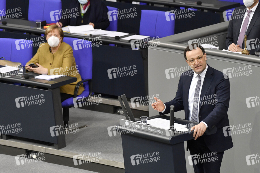 Angela Merkel und Jens Spahn in der 215. Sitzung des Deutschen Bundestages im Reichstagsgebäude. Berlin, 04.03.2021