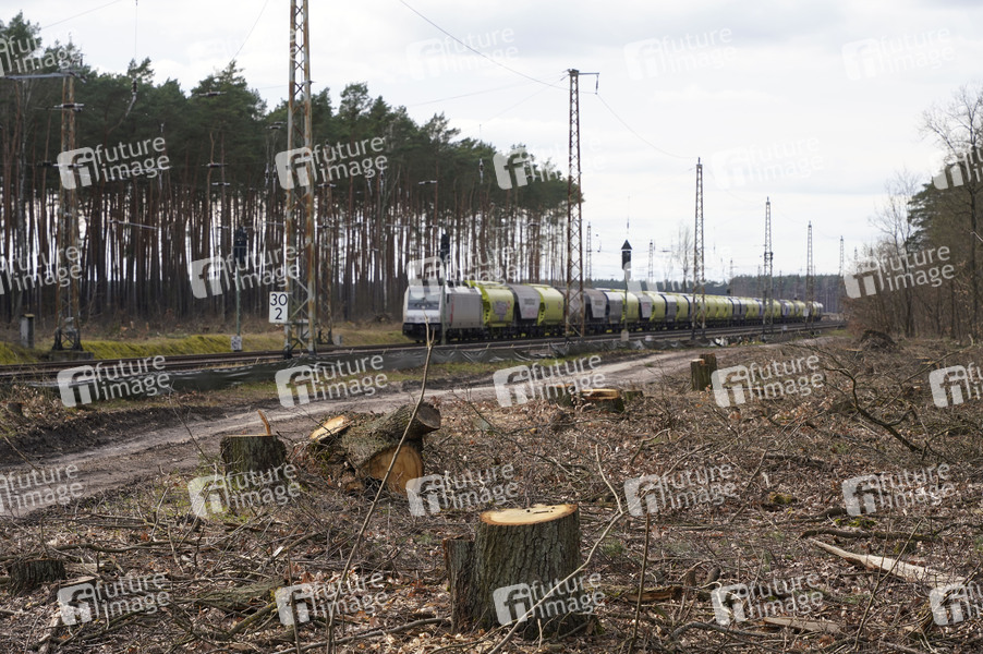 Güterbahnhof Fangschleuse mit abgestelltem Güterzug und Rodung in Vorbereitung der geplanten Erweiterung von Tesla. Die Erweiterungspläne für die Fabrik des Elektroautobauers Tesla in Grünheide (Oder-Spree) bei Berlin sind bei einer Einwohnerbefragung mehrheitlich auf Ablehnung gestoßen. Doch das Votum ist letztlich nicht bindend. Tesla will neben dem 300 Hektar großen Werksgelände einen Güterbahnhof, Lagerhallen und einen Betriebskindergarten errichten. Dafür müssten aber rund 100 Hektar Wald gerodet werden. Das ist umstritten. Es gibt Befürworter der Pläne, aber auch Ablehnung einer Tesla-Erweiterung (Quelle: rbb24). Grünheide, 23.02.2024