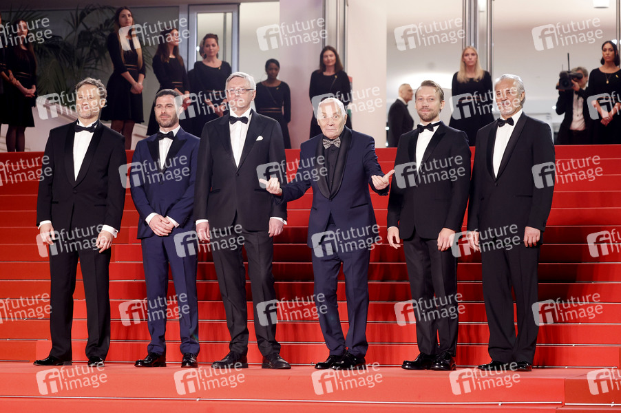 Anatoliy Beliy, Kevin Chneiweiss, Sergei Loznitsa, Aleksandr Filippenko, Aleksander Kuznetsov und Vytautas Kaniusonis bei der Premiere des Kinofilms 'Two Prosecutors / Zwei Staatsanwälte' auf dem Festival de Cannes 2025 / 78. Internationale Filmfestspiele von Cannes im Palais des Festivals. Cannes, 14.05.2025