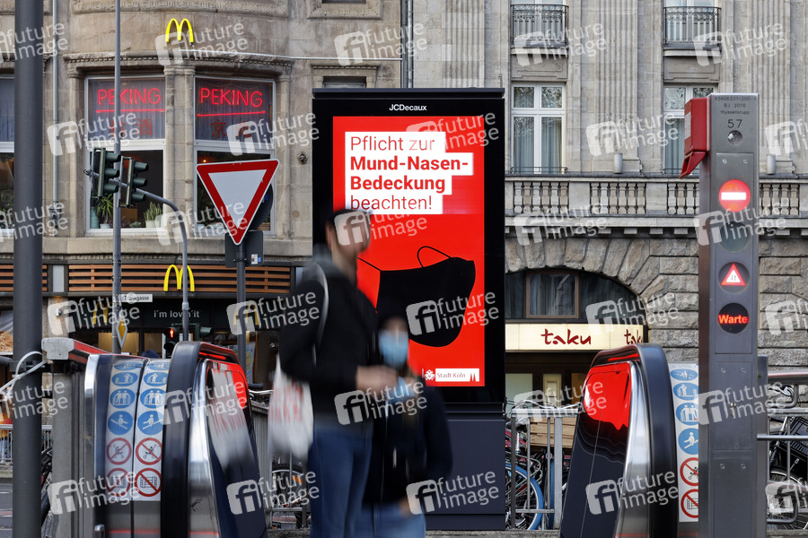 Köln ist weiterhin Corona-Risikogebiet: Inzidenzwert stieg am Samstag auf Inzidenzwert bei 193,9. Im Bild eine Kampagne der Stadt Köln, die Passanten am Kölner Dom auf die dort geltenden Corona-Regeln hinweist. (Themenbild, Symbolbild) Köln, 06.11.2020