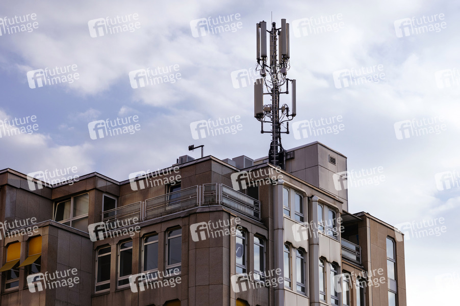 Eine Mobilfunkantennen auf einem Hausdach am Friesenplatz, welche nach populären Corona-Verschwörungstheorien für das Sterben von Vögeln und Menschen im Rahmen von 5G verantwortlich sein sollen. Köln, 20.05.2020