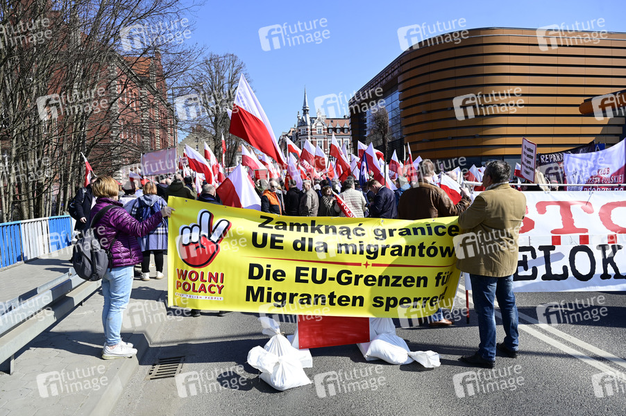 Eine Demo von rechten und nationalen Gruppen aus Polen demonstrieren u.a. gegen die deutsche Asylpolitik am Grenzübergang Görlitz/Zgorzelec - Stadtbrücke, welche aus Sicherheitsgründen mehrere Stunden gesperrt war. Görlitz/Zgorzelec, 22.03.2025