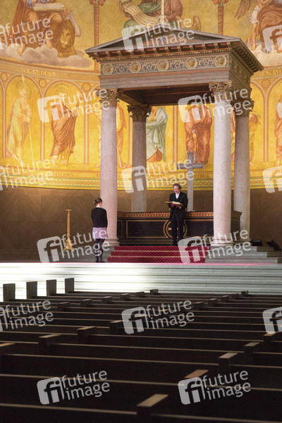 Die Pfarrerin Aline Seel und der Pfarrer Matthias Miele begehen den Karfreitag Gottesdienst in der menschenleeren St. Nikolaikirche. Um 15:00 Uhr ertönten die Glocken der Kirche. Potsdam, 10.04.2020