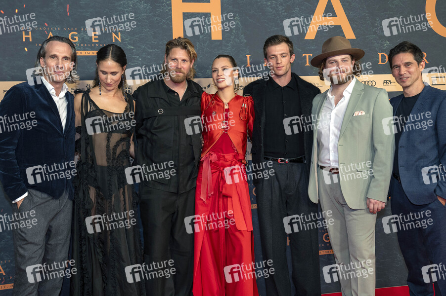 Cyrill Boss, Rosalinde Mynster, Gijs Naber, Lilja van der Zwaag, Jannis Niewöhner, Dominic Marcus Singer und Philipp Stennert bei der Premiere des Kinofilms 'Hagen - Im Tal der Nibelungen' im Mathäser Filmpalast. München, 15.10.2024