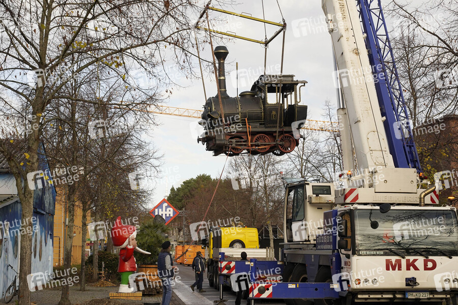 Ein weiteres Filmrequisit für die 'Giant Props' Sammlung ungewöhnlicher Originale, die Lokomotive Emma aus den Jim Knopf Filmen, wird auf der Straße der Giganten im Filmpark Babelsberg aufgestellt. Filmparkchef und 'Lokomotivführer' Friedhelm Schatz organisiert den Transport. Potsdam, 16.11.2020
