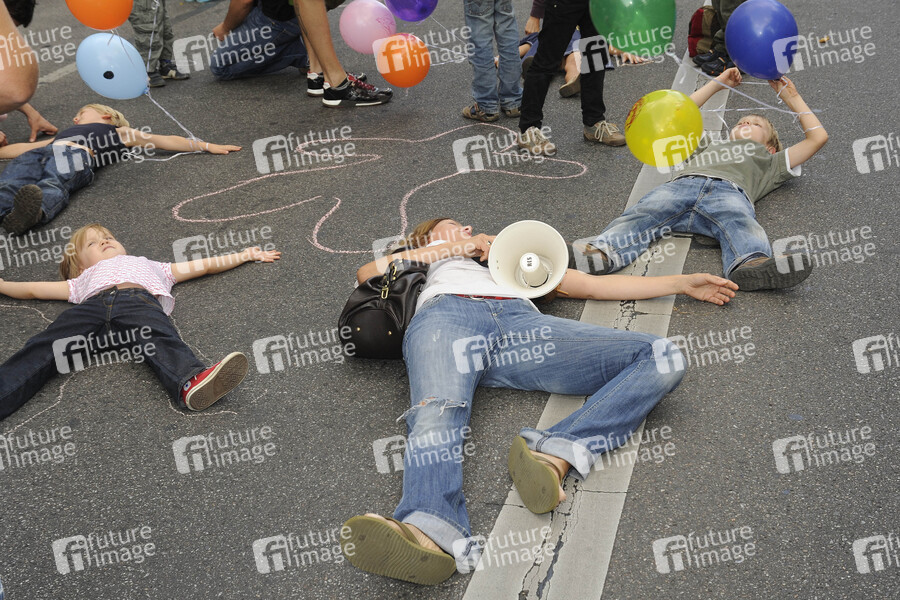 Demo 'Mehr Sicherheit fuer unsere Kinder!''. Bürger des Wohngebiets Bötzowviertel im Prenzlauer Berg, zu denen auch die Schauspielerin zählt, kämpfen für die Verkehrsberuhigung der Strasse 'Am Friedrichshain' in Berlin