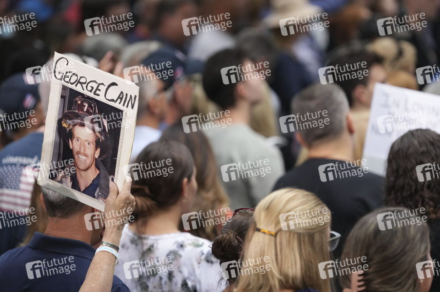 Fotos von Anschlagsopfern bei der Gedenkfeier für die Opfer der Terroranschläge vor 21 Jahren am 9/11 Memorial. Mit Schweigeminuten und der Verlesung der Namen der fast 3000 Todesopfer haben die USA am Sonntag an die Terroranschläge vom 11. September 2001 erinnert. Am früheren Standort des World Trade Centers in New York verlasen Angehörige wie jedes Jahr am 11. September die Namen aller Anschlagsopfer. New York, 11.09.2022