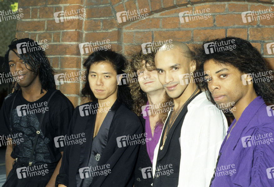 Melvin Brannon II, Blake Sakamoto, Dan Pred, Dan Reed und Brion James von Dan Reed Network bei einem Fotoshooting am Hotel. London, 01.08.1990