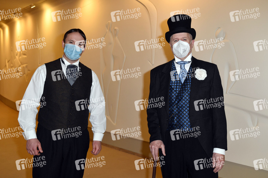 Lorris Andre Blazejewski und Peer Martiny beim Fototermin mit dem (getesteten) Ensemble des Theaterstücks 'Vorhang auf für Cyrano' in Maske und Kostüm vor dem Testzentrum im Schiller Theater. Unter dem Motto 'Testen statt spielen' eröffnen die Komödie am Kurfürstendamm und der KitKatclub ein gemeinsames Testzentrum im Schiller Theater. Berlin, 07.04.2021