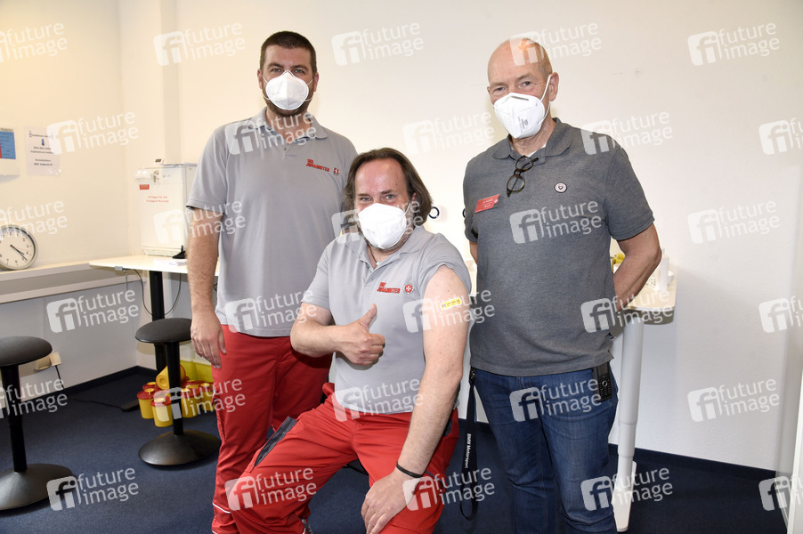Die Schauspieler Franz Josef Strohmeier und Sascha Maaz mit Stationsleister Uli Rubner im Impfzentrum der Johanniter. Oberhaching, 06.06.2021