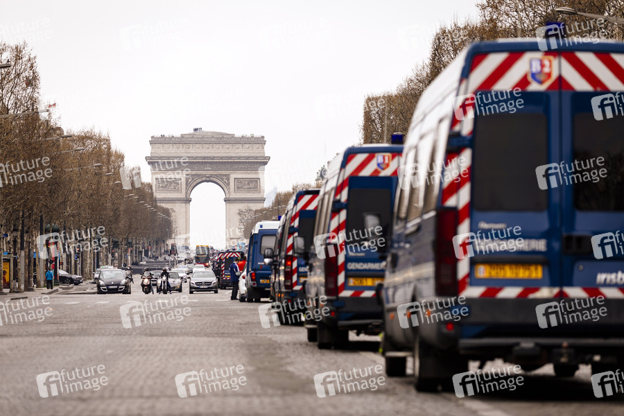 Sicherheitskräfte der französischen Gendarmerie bewachen wichtige Straßen und errichten Checkpoints rund um den Champ Elysees. Paris, 23.03.2019