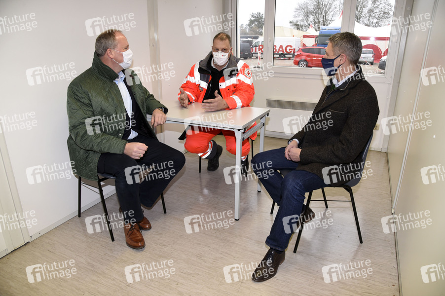 Landrat Christoph Göbel und Bürgermeister Christoph Böck bei der Pressebesichtigung des Impfzentrums Unterschleißheim auf dem Volksfestplatz. Unterschleißheim, 05.12.2020