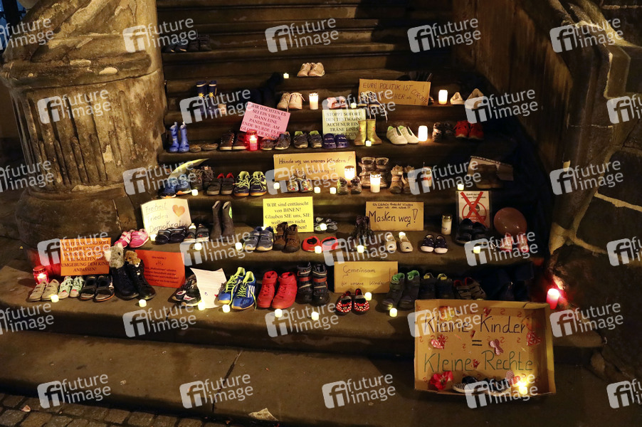 Aus Protest gegen erneute Schulschließungen haben Eltern Kinderschuhe, Plakate und Banner vor dem Rathaus Görlitz abgelegt. Görlitz, .22.03.2021
