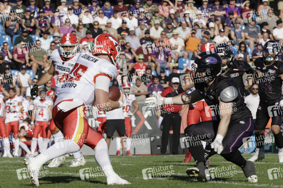 Steven Duncan (15) beim American Football-Spiel Frankfurt Galaxy gegen Madrid Bravos in der PSD Bank Arena Frankfurt. Frankfurt am Main, 10.08.2024