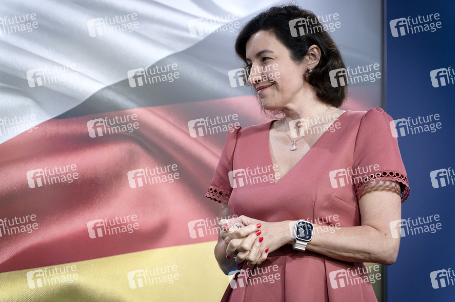Dorothee Bär bei der Unterzeichnung von Absichtserklärungen zur Stärkung der Zusammenarbeit in Wissenschaft, Technologie und Innovation und zur Verlängerung der Raumfahrtkooperation im Bundesministerium für Forschung, Technologie und Raumfahrt. Berlin, 26.06.2025