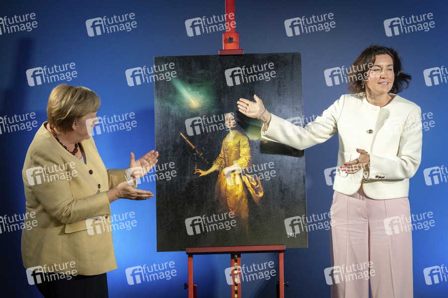 Angela Merkel und Dorothee Bär enthüllen das KI-generierte Bild von Maria Winkelmann-Kirch bei der Ausstellungseröffnung 'Unsichtbare Wissenschaftlerinnen - Versäumte Bilder' im Bundesministerium für Forschung, Technologie und Raumfahrt. Berlin, 16.09.2025