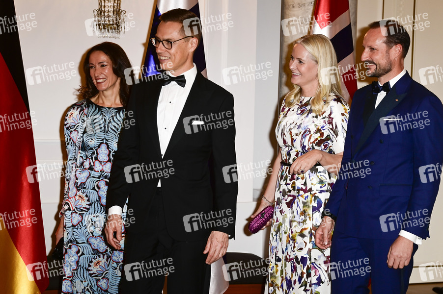 Suzanne Elizabeth Innes-Stubb, Alexander Stubb, Kronprinzessin Mette-Marit von Norwegen und Kronprinz Haakon von Norwegen bei der Ankunft zum Abendessen anlässlich des 25. Jubiläums der Nordischen Botschaften im Schloss Bellevue. Berlin, 21.10.2024