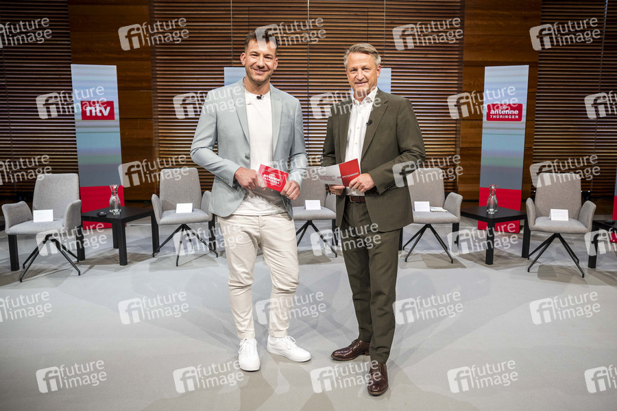 Alexander Küper und Nikolaus Blome bei der Spitzenrunde von Antenne Thüringen und NTV anlässlich der Landtagswahl 2024 in Thüringen. Weimar, 28.08.2024