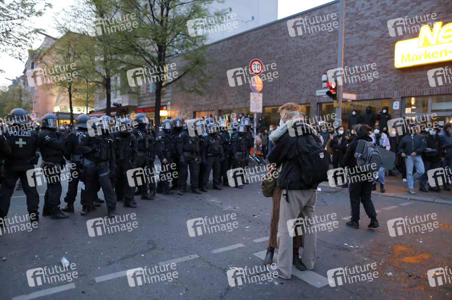 Revolutionäre 1. Mai Demonstration in Neukölln. Bei bei der linksradikalen 1.-Mai-Demo am Abend kommt es zu Ausschreitungen. Demonstranten attackieren Polizisten mit Steinen, Flaschen und Böllern, mehrere Beamte werden verletzt, es kommt zu 240 Festnahmen. Berlin, 01.05.2021