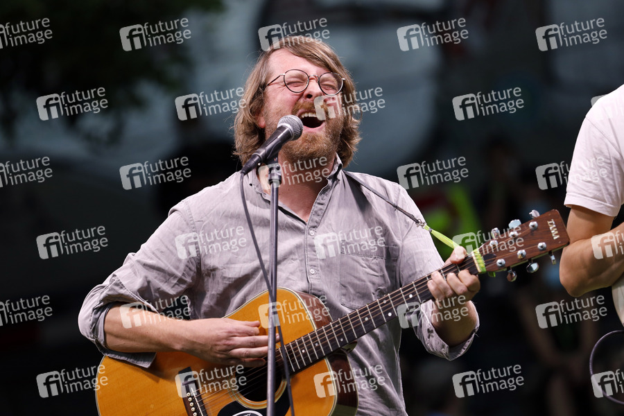 Francesco Wilking von Die Höchste Eisenbahn und Tele bei einer Wahlkampfveranstaltung von Bündnis 90/Die Grünen auf dem Wilhelmsplatz. Köln, 02.09.2021