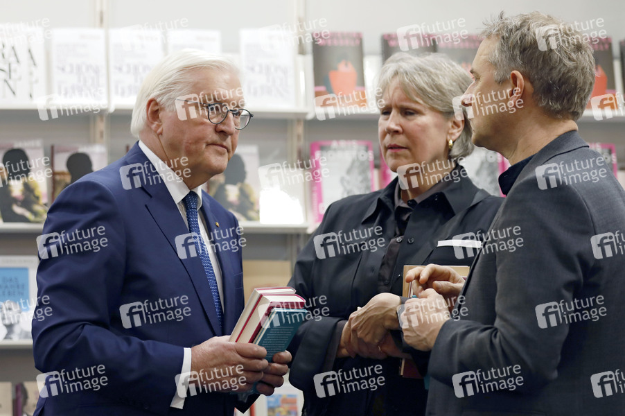 Frank-Walter Steinmeier, Christina Knecht und Jo Lendle am Stand vom Carl Hanser Verlag auf der Leipziger Buchmesse 2024 auf dem Messegelände. Leipzig, 21.03.2024