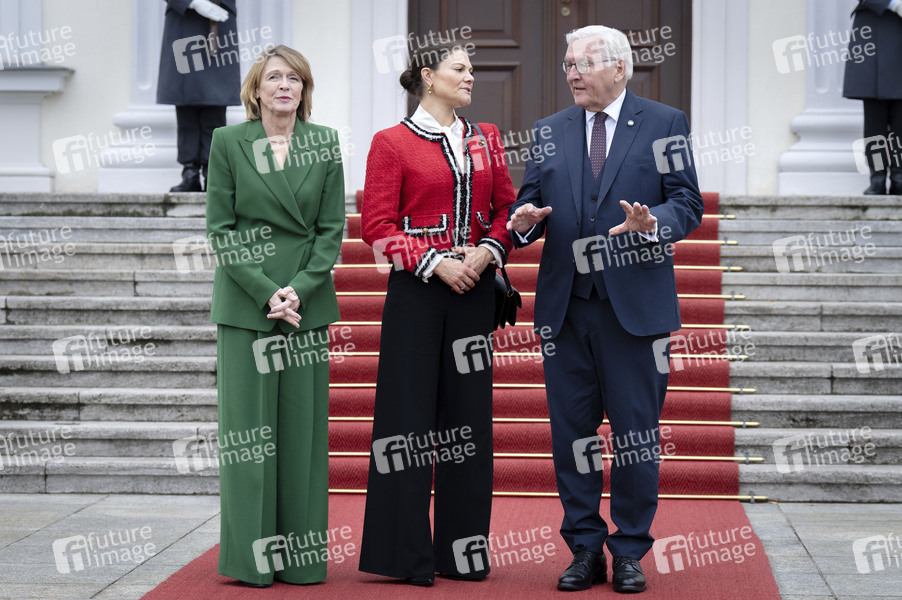 Elke Büdenbender, Kronprinzessin Victoria von Schweden und Frank-Walter Steinmeier beim Empfang zu einem gemeinsamen Gespräch mit dem Bundespräsidenten im Schloss Bellevue. Berlin, 18.11.2025