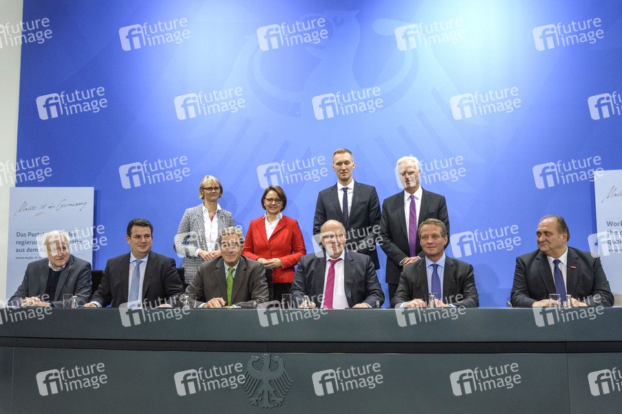 Anja Karliczek, Annette Widmann-Mauz, Daniel Terzenbach, Carl Martin Welcker, Horst Seehofer, Hubertus Heil, Ingo Kramer, Peter Altmaier, Eric Schweitzer und Hans Peter Wollseifer bei einer Pressekonferenz zur Unterzeichnung einer Absichtserklärung durch Vertreter der Bundesregierung und verschiedener Verbände und Institutionen zur Fachkräftezuwanderung im Berliner Bundeskanzleramt. Berln, 16.12.2019