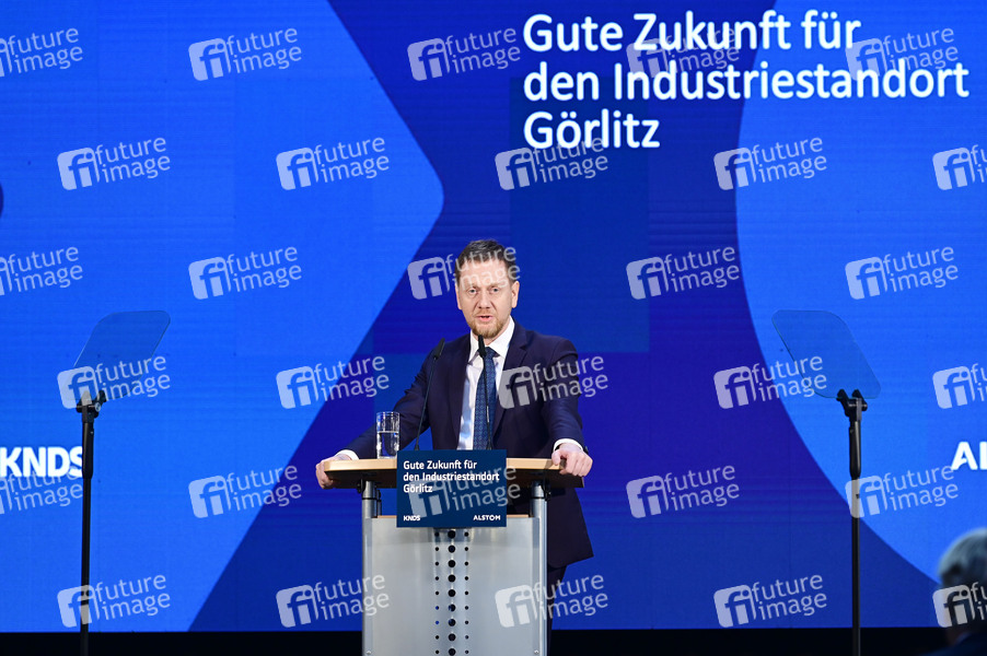 Michael Kretschmer spricht bei Alstom in Görlitz. Vertreter von Alstom und KNDS informieren über die Zukunft des Standortes. Das Unternehmen Alstom, das für die Produktion von Schienenfahrzeugen bekannt ist, wird sich bis 2026 aus Görlitz zurückziehen. Der Rüstungskonzern KNDS wird als neuer Investor den Standort übernehmen. Die Übernahme schafft eine nachhaltige Perspektive für den Standort und einen Großteil der Beschäftigten. Görlitz, 05.02.2025