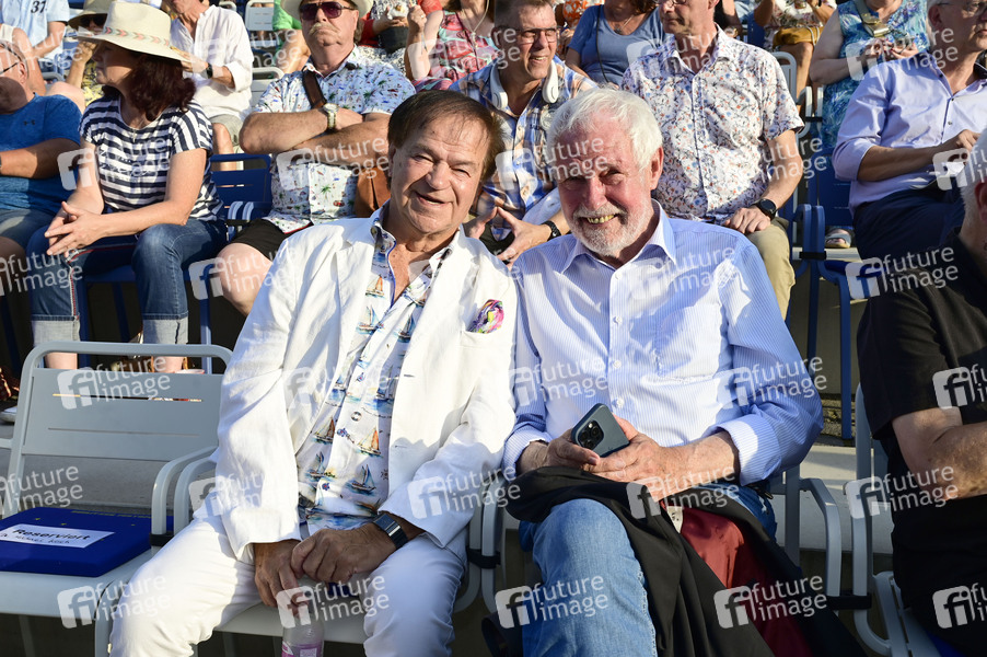 Wilfried Peetz und Klaus Lenk bei der Premiere des Theaterstücks 'Maxe Baumann - Ferien ohne Ende' während der Beelitzer Festspiele 2025 auf der Freilichtbühne. Beelitz, 14.08.2025