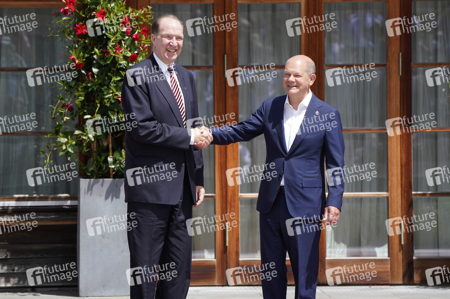 David Malpass beim Fototermin zum erweiterten Familienfoto im Rahmen der Outreach-Arbeitssitzung am zweiten Tag des G7-Gipfels auf Schloss Elmau. Die Staats- und Regierungschefs der G7-Gruppe kommen offiziell unter dem Motto 'Fortschritt hin zu einer gerechten Welt' zusammen und werden globale Themen wie Krieg, Klimawandel, Hunger, Armut und Gesundheit diskutieren. Der Gipfel wird vom anhaltenden russischen Krieg gegen die Ukraine überschattet. Klais, 27.06.2022