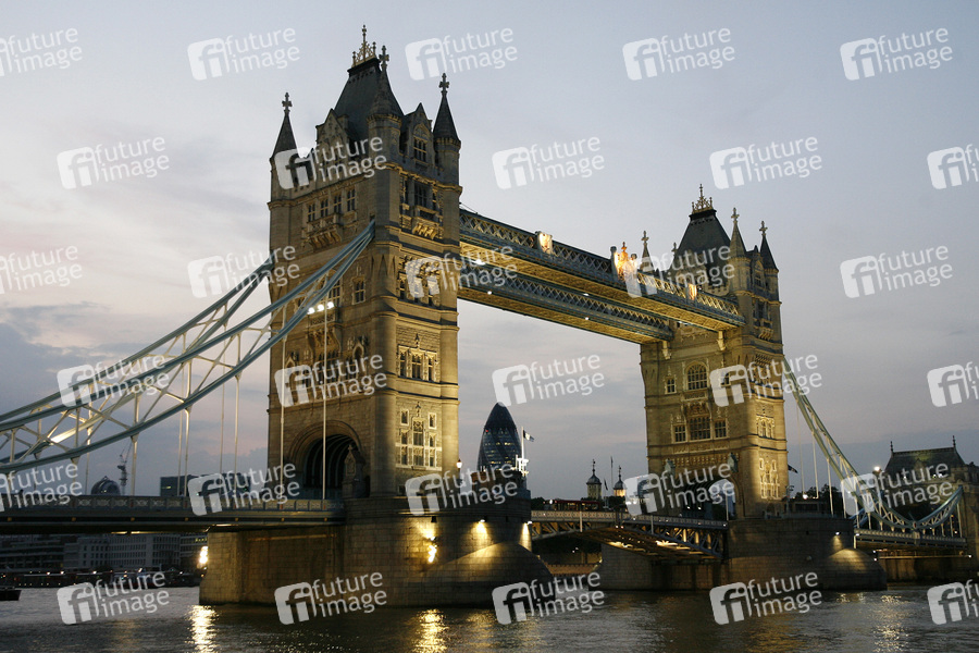 Klappbrücke, Neugotik, 244 Meter lang, Höhe der Brückentürme 65 Meter, die Fahrbahn zwischen den 61 Meter voneinander entfernten Türmen liegt neun Meter über dem Fluss, Fußgängerbrücke in 43 Meter Höhe, die beiden Baskülen können bis zu einem Winkel von 83 Grad hochgeklappt werden, Architekt Horace Jones, erbaut 1886 bis 1894, Themse, Nachtaufnahme