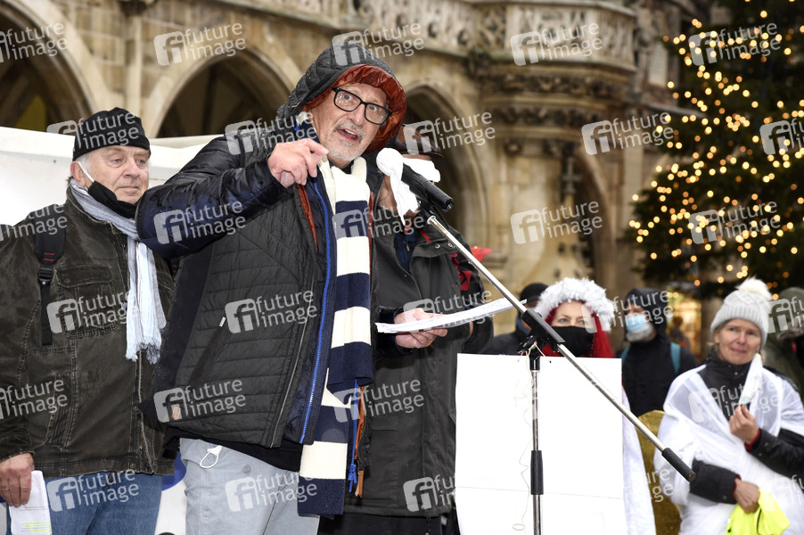 Konstantin Wecker bei der Kundgebung gegen die geplante Steigerung der Rüstungsausgaben unter dem Motto 'Abrüsten statt Aufrüsten' im Rahmen des bundesweiten Aktionstages gegen Aufrüstung und Krieg am Marienplatz. München, 05.12.2020