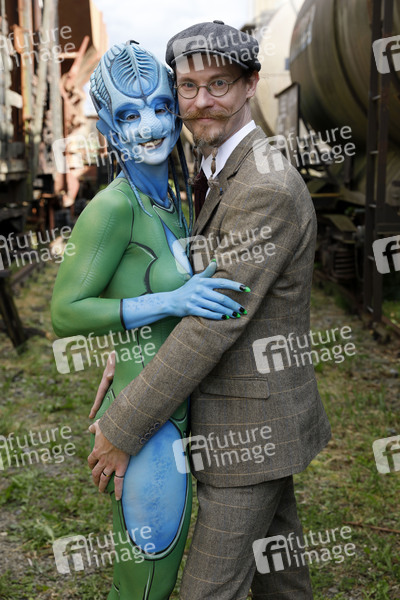 GEEK ART - Bodypainting and Transformaking: 'Aliens besuchen die Erde' mit Barbara als Besucher und Collin als Erdbewohner zwischen abgestellten Eisenbahnwaggons an der Weser. Hameln, 17.06.2020 - Ein Projekt des Fotografen Tschiponnique Skupin und des Bodypainters und Transformakers Enrico Lein