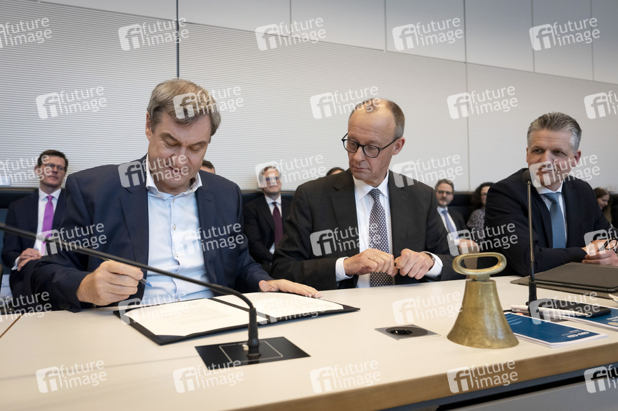 Markus Söder, Friedrich Merz und Thorsten Frei bei der konstituierenden Fraktionssitzung mit Unterzeichnung des Vertrags über die Fortführung der Fraktionsgemeinschaft von CDU und CSU im Reichstagsgebäude. Berlin, 25.02.2025