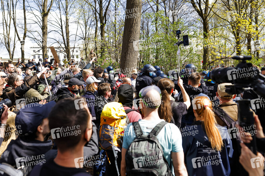 Tausende Demonstranten haben sich am Mittwoch auf der Straße des 17. Juni versammelt, um gegen die staatliche Corona-Politik zu protestieren. Wegen vielfacher Verstöße gegen die Corona-Auflagen wurde die Demo von der Polizei aufgelöst. Berlin, 21.04.2021